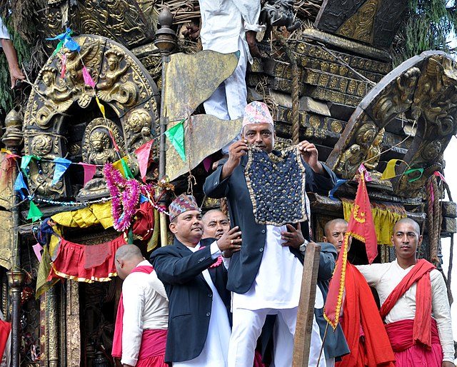 - Bhoto Display: On the final day, the sacred bhoto is displayed from the chariot at Jawalakhel. A high-ranking official, often with the Kumari (living goddess) and dignitaries, holds up the vest four times, facing each cardinal direction, symbolizing its presentation to the world.