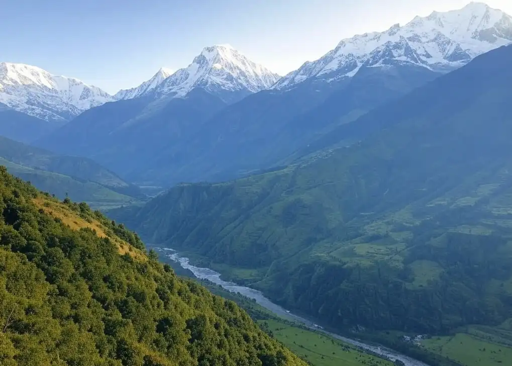 An overview of the Manang Valley in Nepal, featuring the snow-capped Annapurna peaks and the Marsyangdi River.